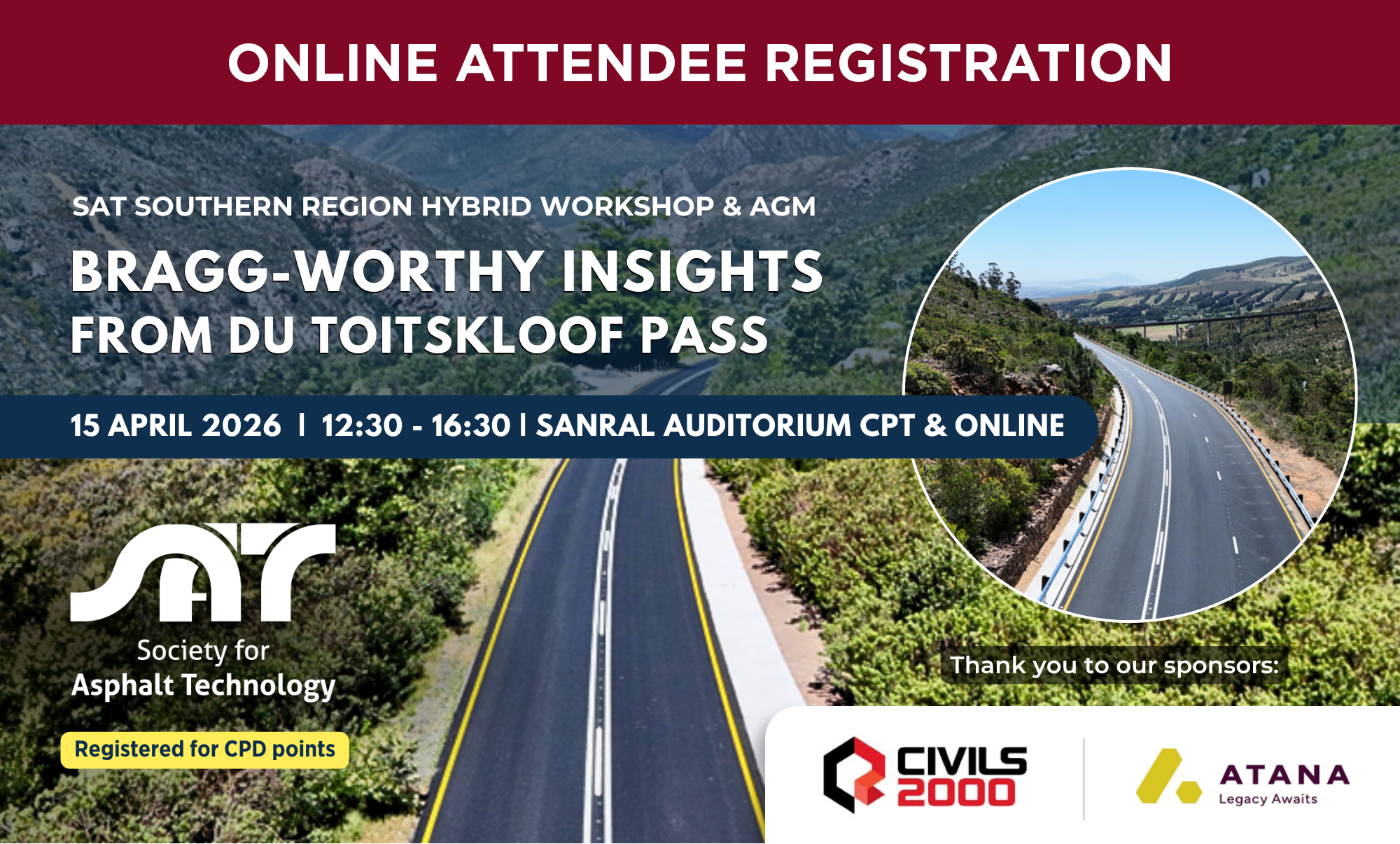 Join the SAT Southern Region for an engaging and informative online workshop exploring the latest insights, considerations, lessons-learnt and real-world applications of BRAGG technology — with a special focus on Du Toitskloof Pass, which was recently resurfaced.